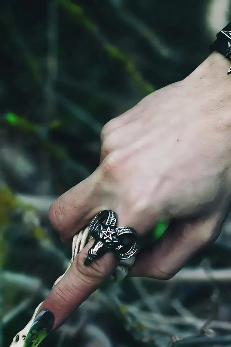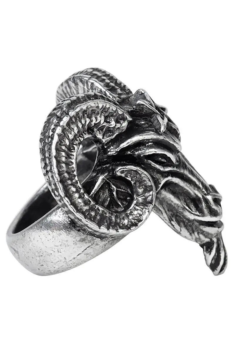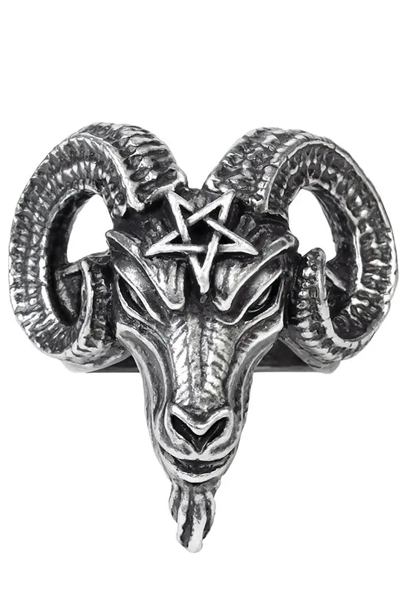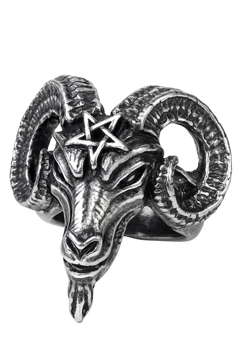 Summon blasphemous spirits from below with the wave of your finger, bewitched with this satanic ring. Constructed of premium pewter, this occult ring features the head of Baphomet with a pentagram engraved on his forehead. Select your size for the sinfully perfect fit.