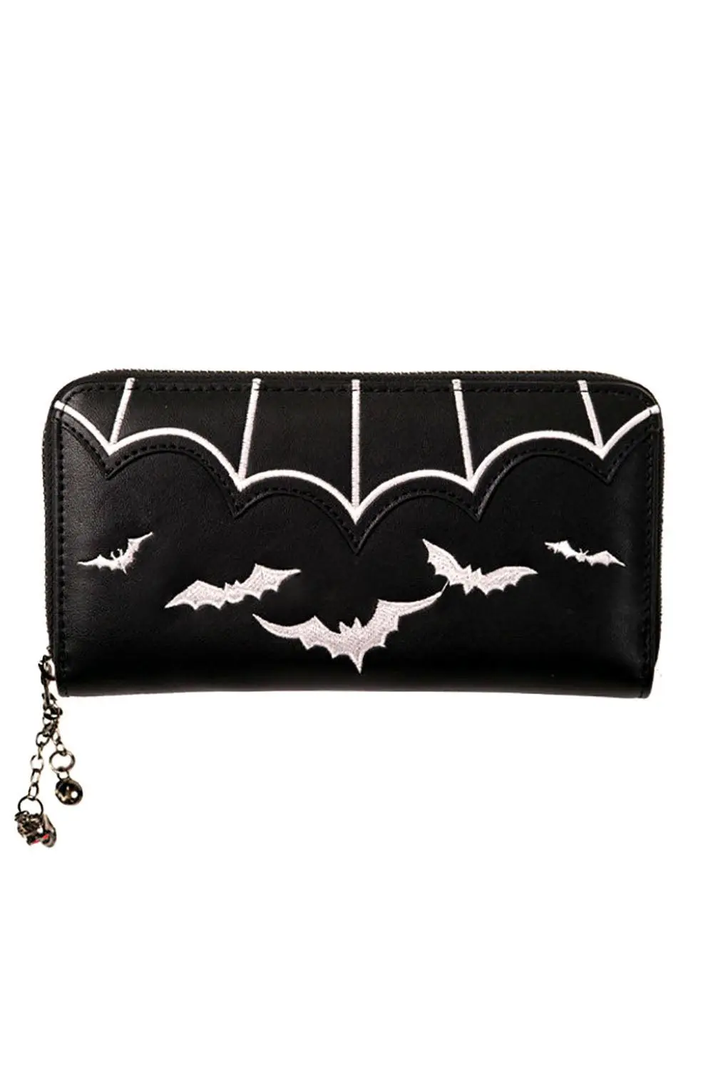 Take flight with this beautiful bat wallet! Constructed of premium vegan leather, this goth wallet features a cauldron of ghostly white bats and embroidered batwing detail. With 8 card compartments + change pocket, this gothic wallet is perfect for keeping your money safe and spooky!