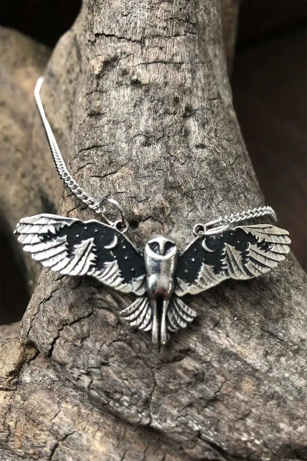 Let the wisdom of the great old owl guide your path with this enchanting necklace! The symbol of wisdom and soul, this mystical owl is beautifully engraved with nightly visions of crescent moons, twinkling stars, and forested pine trees. Roam the woodlands wearing this otherworldly necklace, finished with a lobster claw closure for a spooky strong hold.