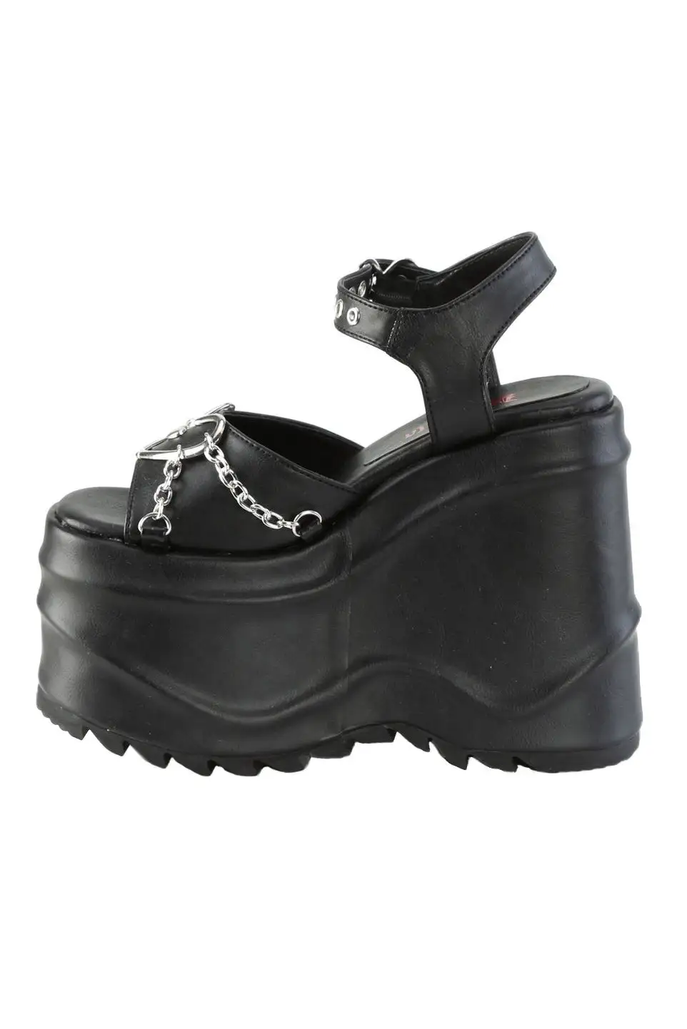 Follow your dark heart wearing these darling Demonia mary janes, haunted with a wicked 6″ platform! Made of black vegan leather, these gothic wedges feature silver heart ring hardware and metal chain detailing. Adjust the buckled ankle strap for the perfect punk fit. Pair these street goth platforms with a maxi skirt and oversized sweater for winter witch feels.