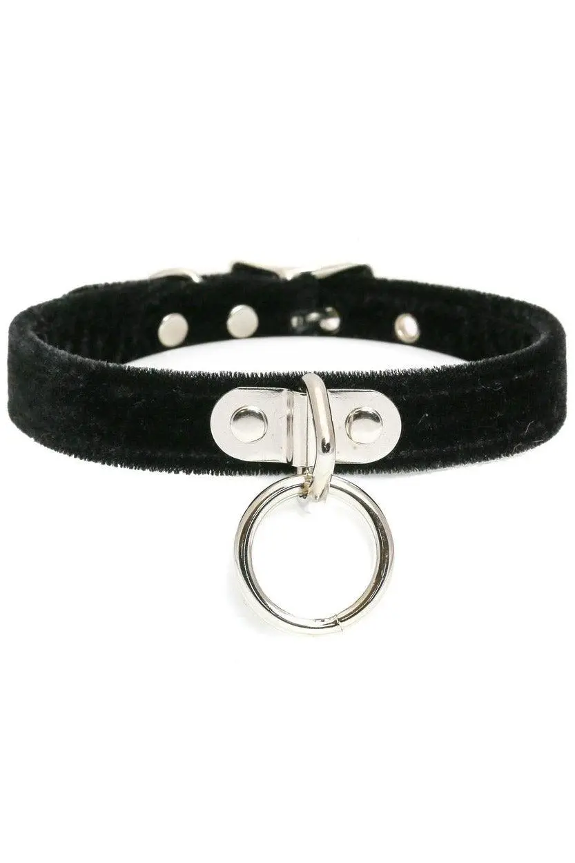 Every goth girl + boy needs a statement choker to creep out their closet. This staple o-ring collar is constructed of deluxe velvet for some gothic elegance. Wear it all night + day to summon some sexy spooks to your style!
