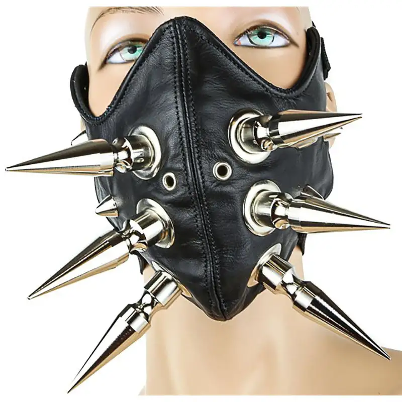 Genuine premium leather mask with 3 giant 3″ spikes on each side, plus smaller stud spikes. 2 elastic straps hold mask in place.