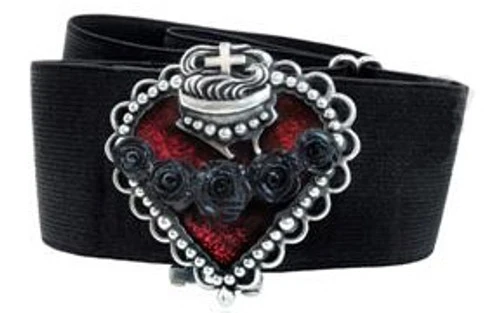 nurse-style 50mm black elastic belt with enamelled, single piece buckle; translucent red enamel & black pewter roses.