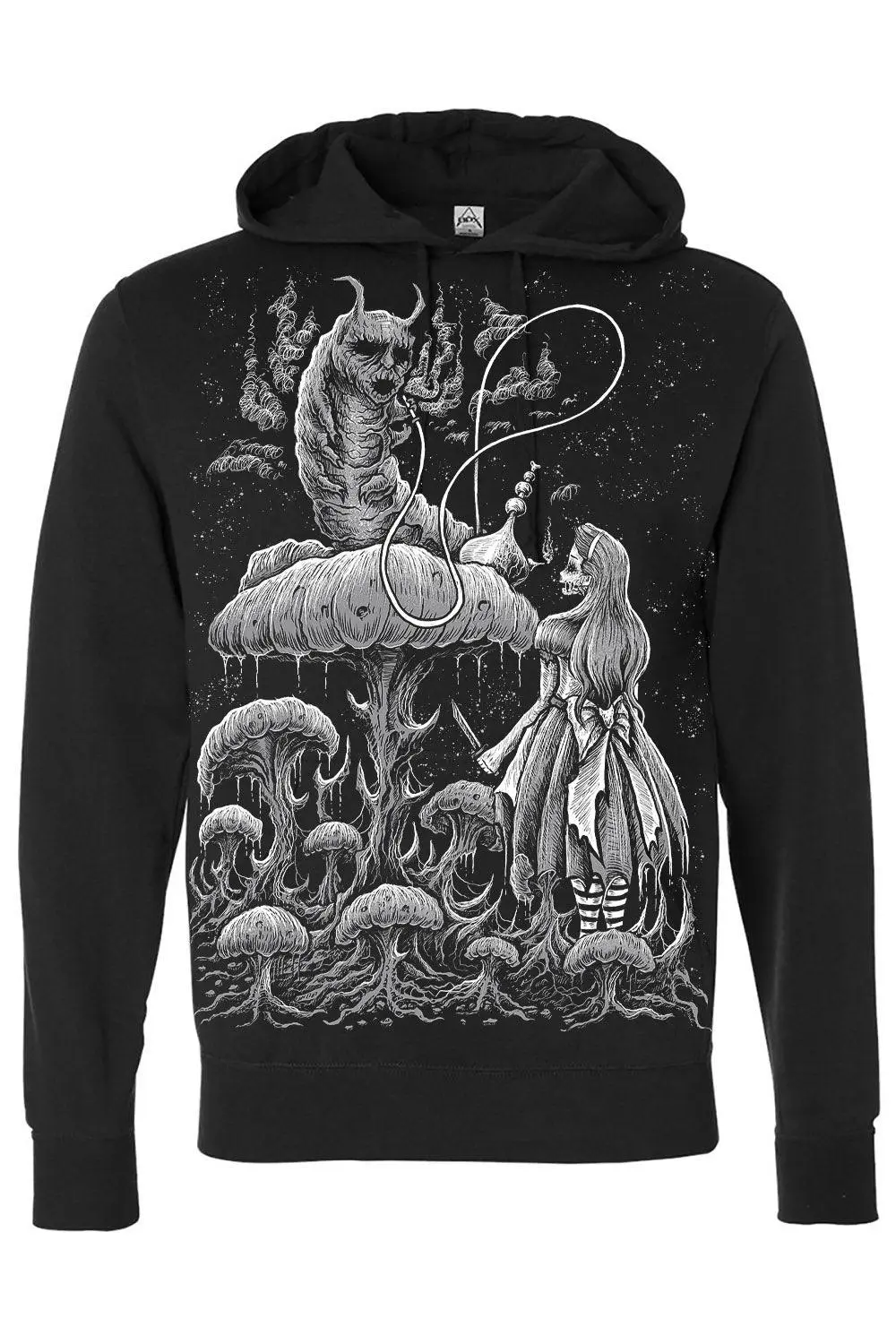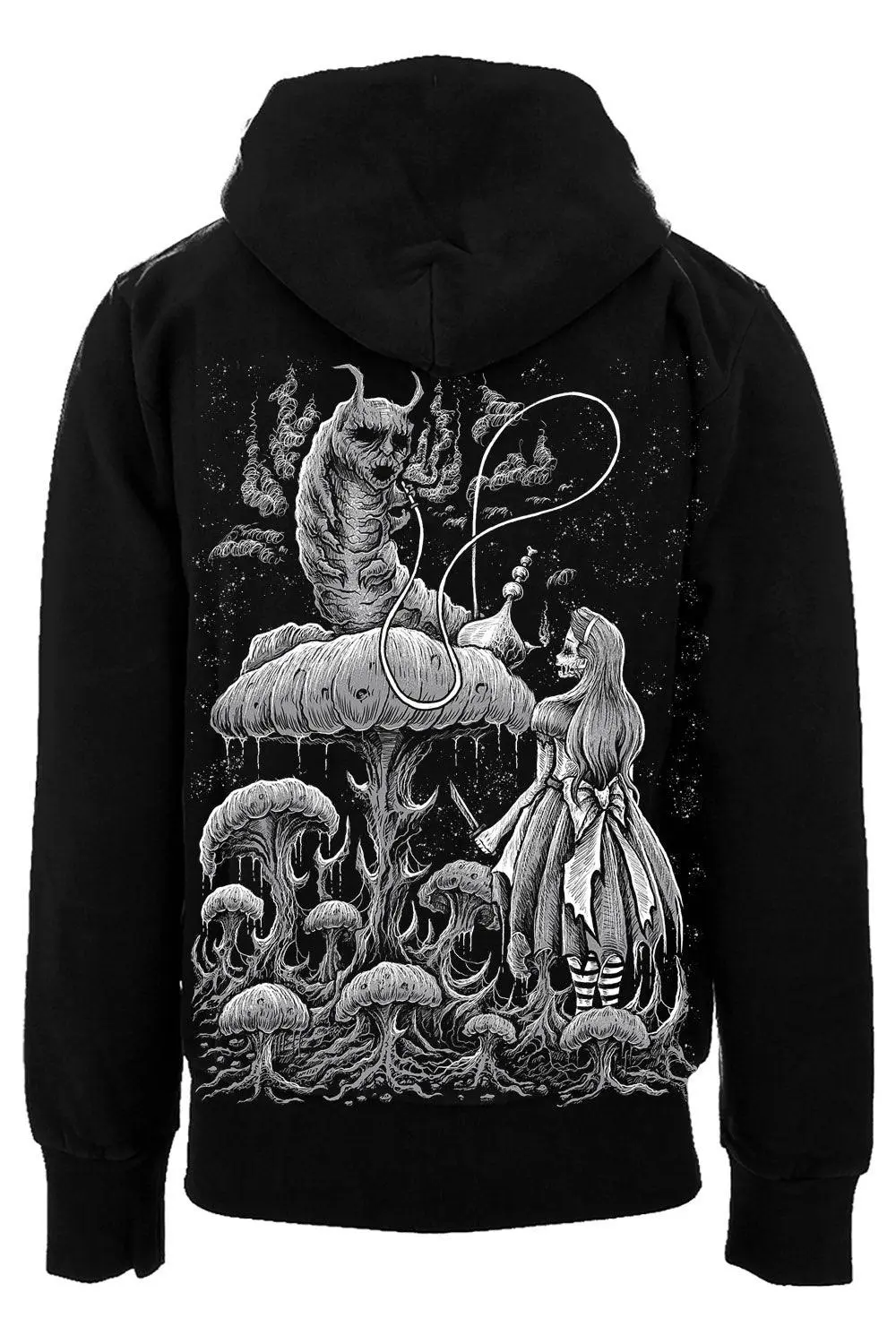 Fall down the rabbit hole wearing this gravely goth Alice in Wonderland hoodie! Sinfully soft, this hautning hoodie features Absolem the Caterpillar smoking hookah on a morbid mushroom. Wearing a tattered dress and striped tights, Alice lurks below with a knife in hand… waiting for the spooky smoke to guide her through the weird, whimsy world of Wonderland.