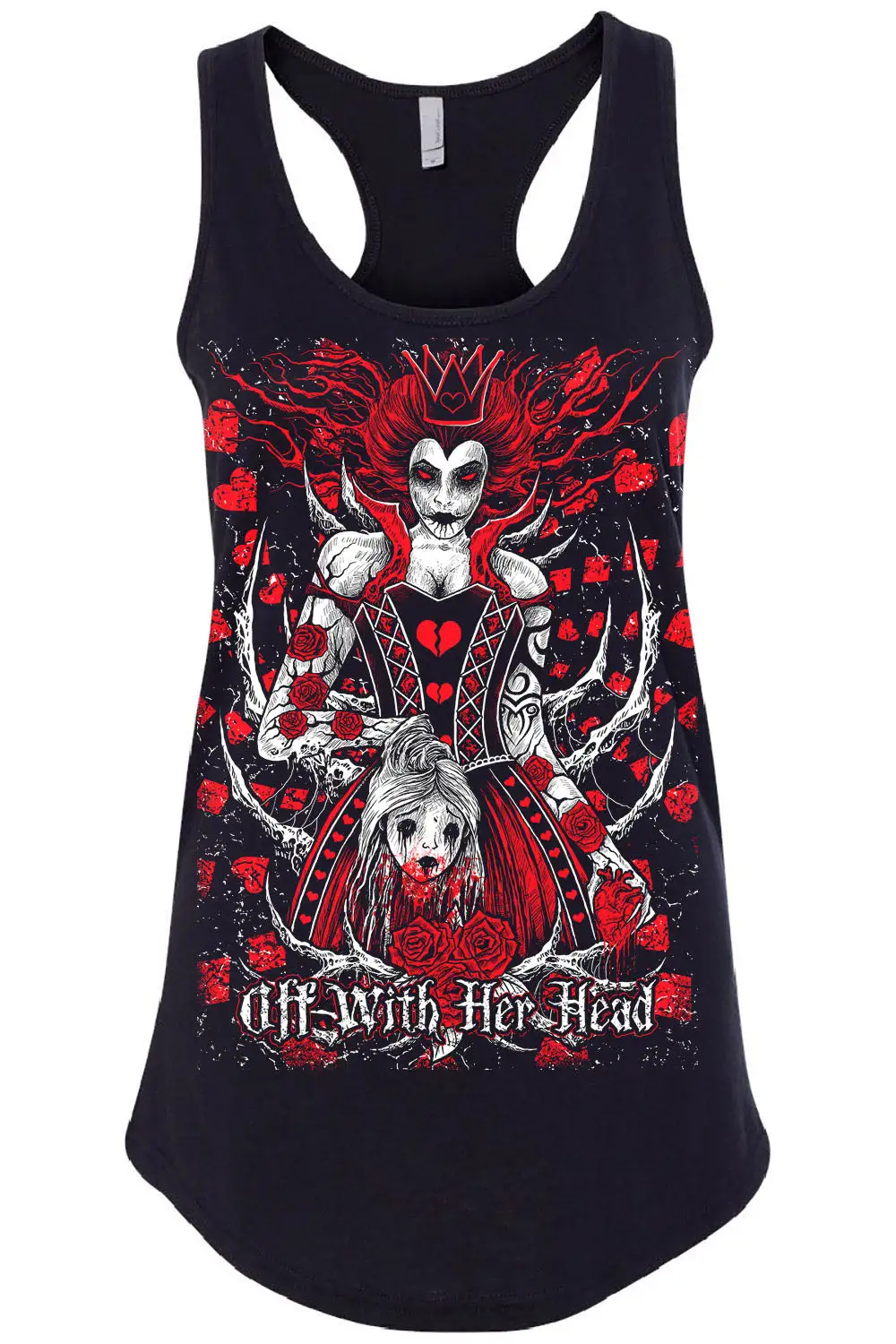 Fall down the rabbit hole, but don’t lose your head. This gory, goth tee features the Queen of Hearts holding Alice’s decapitated head in one hand, and her still-beating heart in the other. With hair that twists into gnarled tree branches, blood-red eyes, and card suits all around, the Queen of Hearts has at last claimed her revenge on Alice in Wonderland.  Â