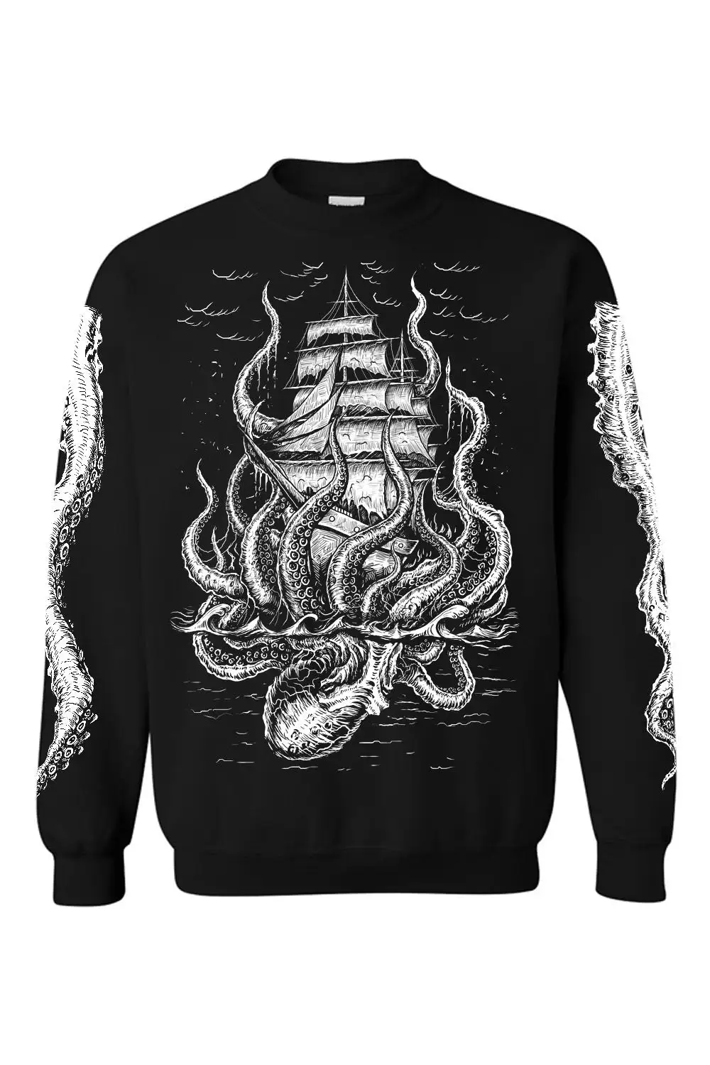 Invoke monsters of the deep with this killer Kraken sweatshirt! A pirate ship under the Kraken’s attack haunts the front—octopus tentacles possess the sleeves. Make dark waves in the criminally cozy construct, made of sinfully soft cotton! The Kraken takes no prisoners…. and neither do you.