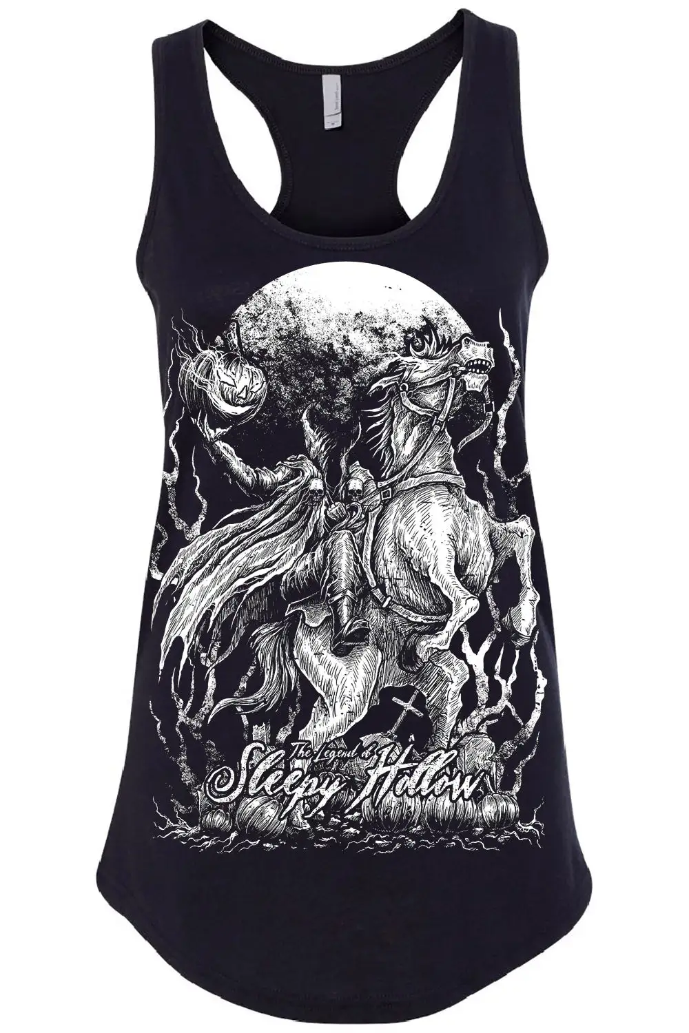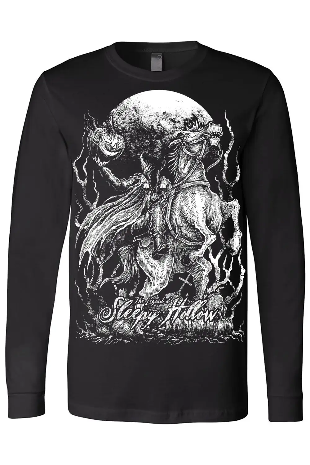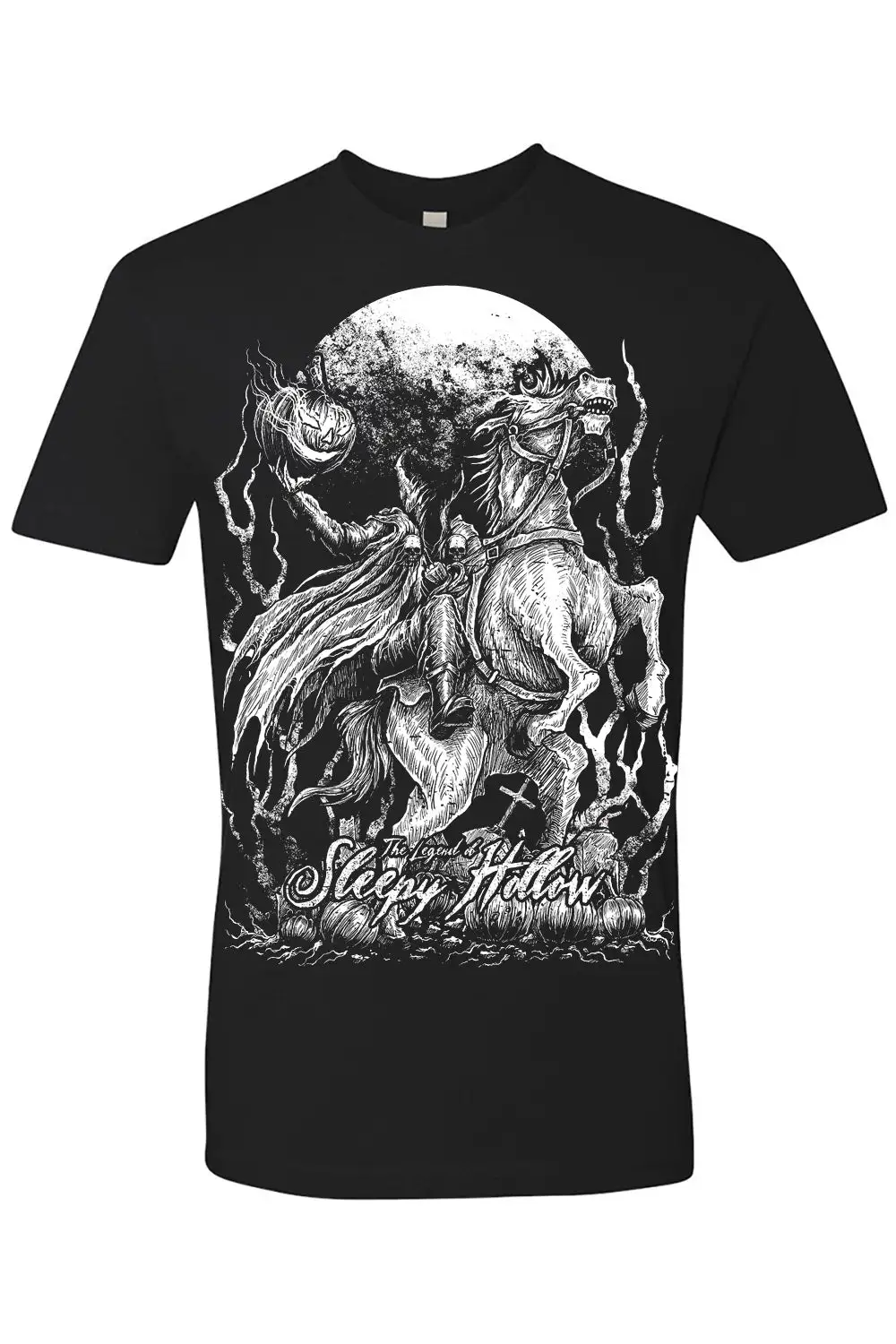 Ride into the dead of night in this chilling fantasy tee! Treat every day like Halloween in the heavy metal design, featuring the Headless Horseman riding his infernal horse and hoisting his disembodied pumpkin head. The words The Legend of Sleepy Hollow haunt the cemetery of jack-o-lanterns in fiendish font below, paying homage to Tim Burton’s horror movie masterpiece.